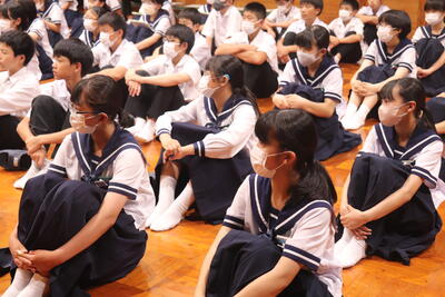 校長先生のお話では、「1学期の終業式で、この夏休みにしかできないことに、チャレンジし、家庭の一員としてお手伝いをしてください。とお願いをしたことを守れたでしょうか?今からこの2学期に、皆さんに頑張って欲しいことを2つお話しします。