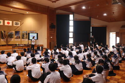 最後に一成先生から、「皆さんには夏休みしっかり遊んで、たくさんの思い出をつくってほしいと思っています。ですが、危険なことはしない、危険な所に行かない、安全に遊ぶことを約束してほしい。楽しいこと、魅力的なことの裏には必ず危険が潜んでいるということを忘れないでほしい。」と自分の命を自分で守ることの大切さについてお話しくださいました。