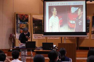 「税に関する作文」を書く時のヒントや、疑問探しの手助けになるようにと、スライドでのクイズや、パワーポイントの資料をもとにお話ししていただきました。