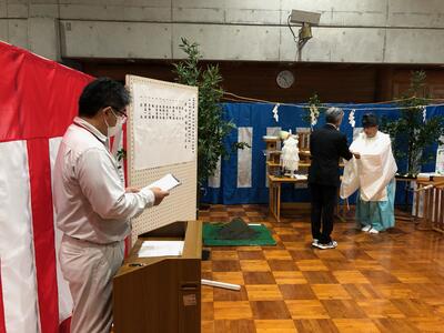 8月10日 木曜日に、学校施設環境改善交付金事業 日之影中学校 大規模改造工事 安全祈願祭が、本校多目的ホールで行われました。これは、本校に設置されるエレベータ工事に伴うものです。