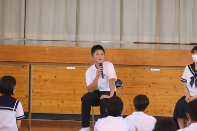 高校生活についても、高校入学時は、初めは不安しかなかったこと。そこから、自分から話をして、視野を広げていくことで楽しくなったこと。自分の目標とする先輩を見つけて努力してきたこと。誰かの姿を見て学ぶことはとても大事であること等、これから高校進学等を志す本校生徒後輩にとって、貴重なアドバイスをいただきました。