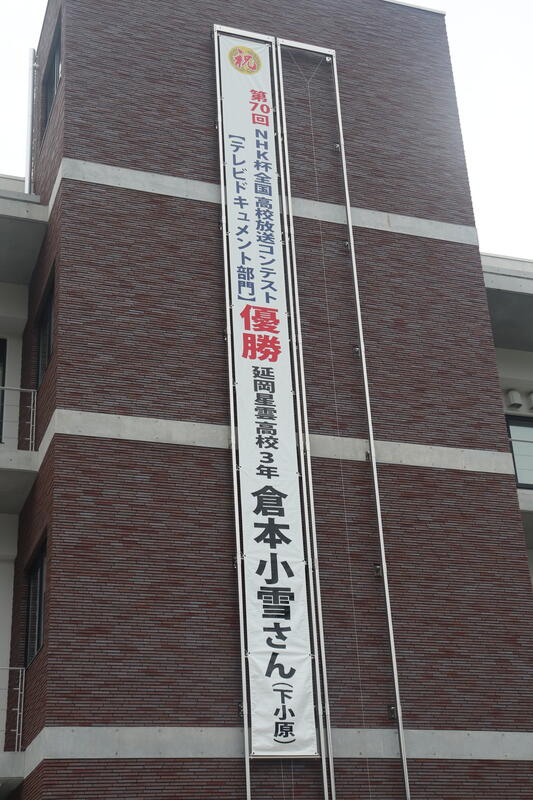※町役場に掲げられています、本校卒業生 倉本さんの「第70回NHK杯全国高校放送コンテスト」全国大会 テレビドキュメント部門 最優秀賞受賞(日本一)を祝う垂れ幕です