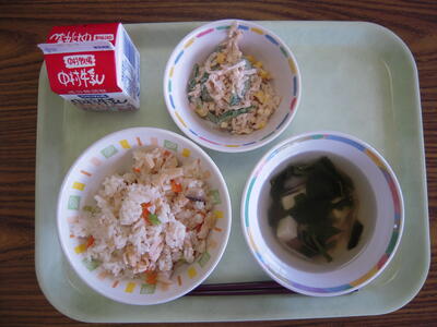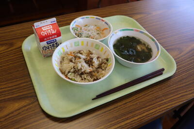 今日の給食献立は、「豆腐のすまし汁」「千切り大根のオーロラソースあえ」「たけのこご飯」「牛乳」です。