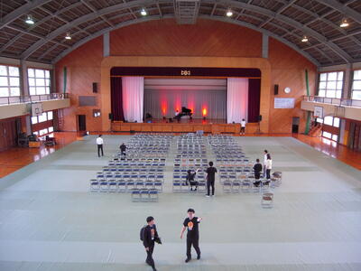 第29回宮崎国際音楽祭 徳永二男 ふれあいキャラバンコンサートのリハーサルが体育館で行われいます。14:30開演です。