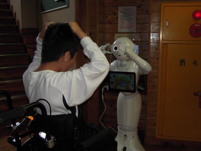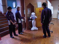 生徒の皆さんがペッパー君の前を通り過ぎると、ペッパー君がダンスを始めました。「一緒に踊ろう!!」とペッパー君が誘うと、生徒の皆さんが足を止めています。