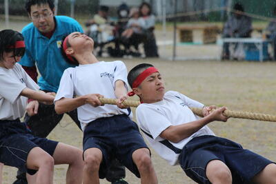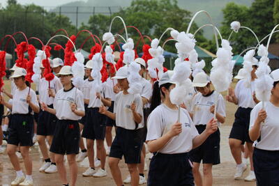 体育大会の見物の一つに「団ダンス」があります。子どもがダンスを考え、団長や副団長、リーダー、ダンスが得意な子どもが中心となってダンスを作り上げます。「右足は・・・。その時、左手は・・・。」などと説明はするものの、体がついていかず・・・、というシーンも見られます。しかし、学年関係なく笑顔と笑い声が絶えない貴重な時間となっています。がんばれ、赤団・白団。
