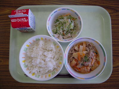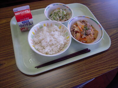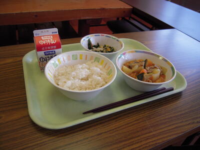 今日の給食献立は、「大和煮」「いものこ汁」「ご飯」「牛乳」です。