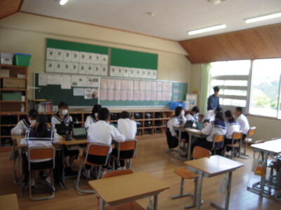 1年生A組・B組、それぞれに電子黒板1台ずつ入りました。この電子黒板は、各教室に1台ずつ設置されています。デジタル教科書はもちろんですが、タブレット端末とつなぎ、子どもの意見や考えを表現するツールの一つです。また、先生からの教材を提示するなど、授業になくてはならないものの一つです。町教育委員会から今年度、2台設置していただきました。ありがとうございます。