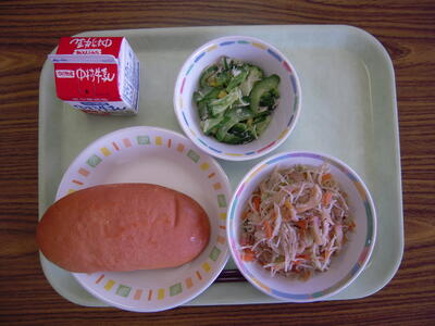 今日の給食献立は、「豆腐のすまし汁」「やさいのさっぱりあえ」「ご飯」「牛乳」です。