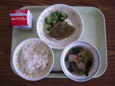 今日の給食献立は、「魚の釜炒り番茶揚げ」「ブロッコリー」「豆腐と小松菜のすまし汁」「ご飯」「牛乳」です。