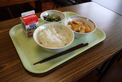 今日の給食献立は、「ジャガイモとベーコンの煮物」「いそかあえ」「ご飯」「牛乳」です。