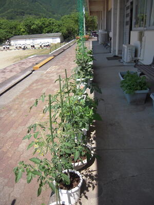いろいろな野菜をプラター栽培しています。日に日に大きくなっています。もっと、もっと大きくなーれ。そして、たくさん実がなりますように・・・。