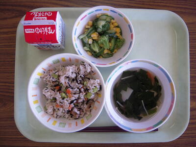 今日の給食献立は、「厚揚げのそぼろ煮」「わかめときゅうりの甘酢あえ」「ご飯」「牛乳」です。