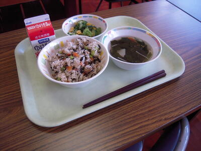今日の給食献立は、「ひじきの炒り煮」「つぼん汁」「ご飯」「牛乳」です。