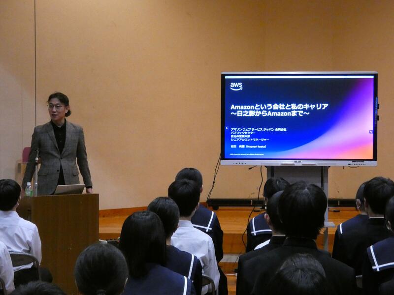 講師は、日之影中出身で、「Amazn(アマゾン)」でシニアアカウントマネージャーをされている岩田尚徳様です。現在の職業に就くまでの過程や、仕事に対する姿勢などについてお話をいただきました。生徒は興味深く聞いていました。