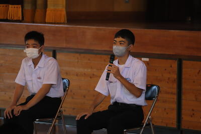 まずは校長先生との対話です。1年生からは飯干 昊さん、2年生からは春田 蒼史さん、全校専門委員会から2年後藤 壮瑛さん、3年生から甲斐 優明さんが生徒代表として夏休みを振り返りました。