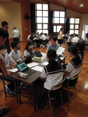 本日からALTによる夏休み英会話講座が始まりました。この取組は、昨年度から始まり、本年度が2年目となりました。各生徒が持っているタブレット端末を使い、学校と家庭をオンラインでつなぎ、ALTとの英会話を行います。一人当たり10分程度ですが、「ALT」と「ICT」の2つの条件が揃ったからこその取組です。日之影ならではの取組の一つです。部活動で学校に来ている生徒は、対面で英会話を行っています。