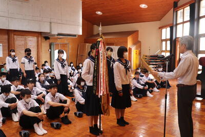 まず、女子ソフトテニス部団体戦では、昨年に引き続き優勝し、優勝旗を貢納しました。そして、個人戦で入賞した選手を表彰しました。