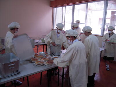 1年生は、ランチルームで給食です。配膳は給食係。他の生徒の皆さんは、自分の席で静かに座って待っています。