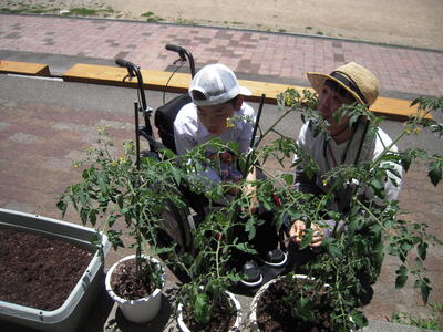 枯れてしまった葉っぱをはさみを使って切りとり、野菜のお世話をしています。