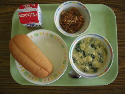 今日の給食献立は、「ミートサンド」「ふわふわ卵のオニオンスープ」「牛乳」です。