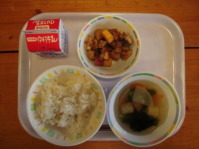 今日の給食献立は、「大和煮」「はんぺん汁」「ご飯」「牛乳」です。