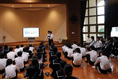 今朝、新生徒会役員の皆さんによる「生徒集会」を行いました。執行部や専門部の紹介を行った後、各部による活動の反省や今月の活動目標・具体策などを発表してくれました。