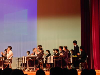 重松さんによる特別授業では、会場のステージに上がった、事前に希望した高校生や中学生の代表20名の発表をもとに、重松さんが進行をつとめ、地域の魅力や人のやさしさなどについて、意見を交わしました。
