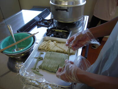 昨日に引き続き、イベント班の皆さんが調理室で、「ユズ」と「抹茶」を使ったうどんづくりに挑戦しました。