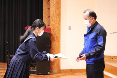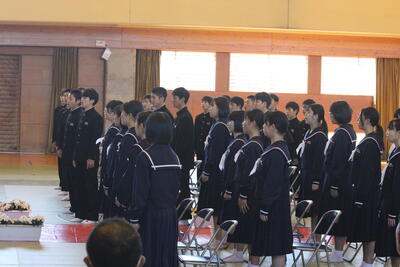 教頭 濵砂 俊洋 先生は、県教育委員会 中部教育事務所に異動になりました。事務室の大塚 道夫先生は、五ヶ瀬町立五ヶ瀬中学校に異動になりました。生徒を代表して、甲斐 文葉さんがお礼の言葉を述べました。