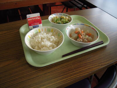 今日の給食献立は、「大根のそぼろ煮」「野菜のごま酢あえ」「ご飯」「牛乳」です。