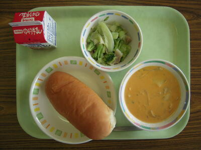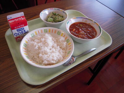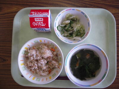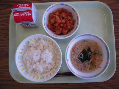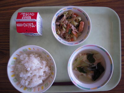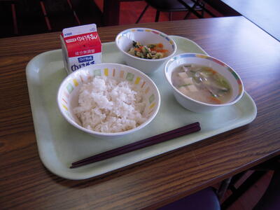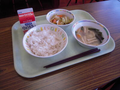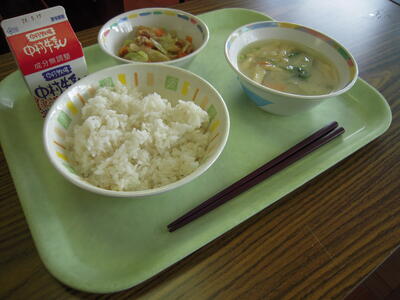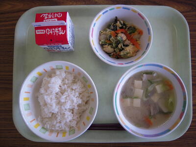 今日の給食献立は、「豆腐のすまし汁」「やさいのさっぱりあえ」「ご飯」「牛乳」です。