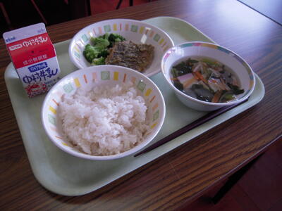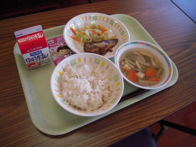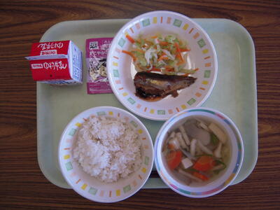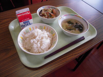 今日の給食献立は、「魚のみそ汁」「野菜の甘辛炒め」「ご飯」「牛乳」です。