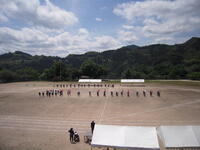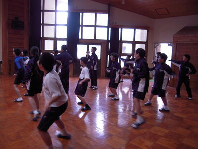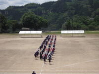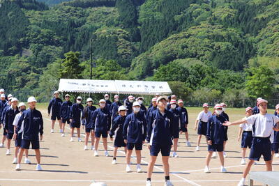 日之影中学校の体育大会の伝統種目の一つに「花輪棒体操」があります。全校生徒がリズム合わせ、心を一つにして行進します。練習を重ねると、集団の美が際立てってきます。