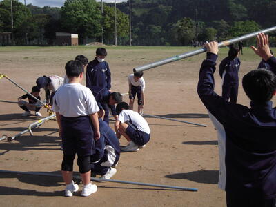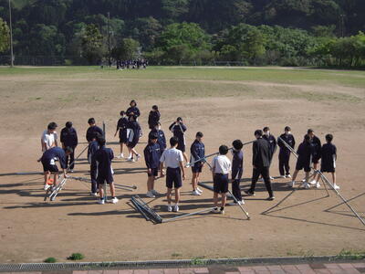 5月12日(日)体育大会を開催予定です。種目練習はもちろんですが、会場設営も大切なことです。学年関係なく、全校生徒が力を合わせて、怪我のないようテントの骨組みをつくりました。