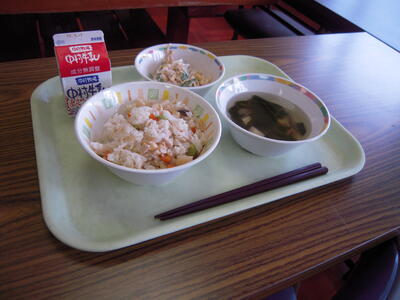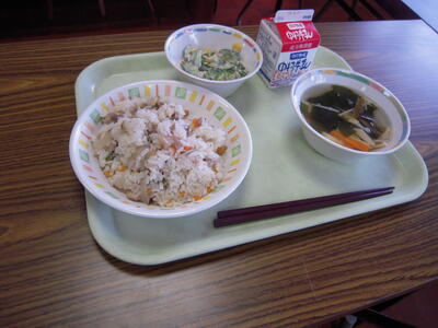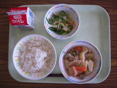 今日の給食献立は、「豆腐のすまし汁」「千切り大根のオーロラソースあえ」「たけのこご飯」「牛乳」です。