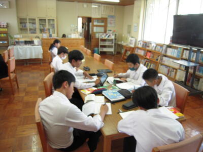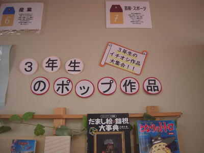 3年生が国語の授業の中で、図書室にある蔵書を分かりやすく、かつ、簡潔に紹介するポップ作品を作りました。分かりやすくするために、画用紙の色や大きさ、絵、文章を考え抜いて作ったようです。表現する活動の一つですが、生徒の皆さんはとても楽しく作っていました。素敵な作品ができあがりました。図書室に飾ってあります。