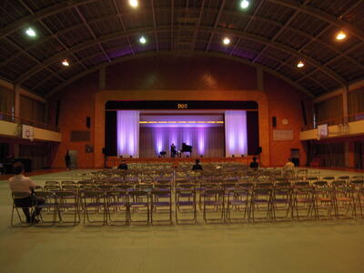 第29回宮崎国際音楽祭 徳永二男 ふれあいキャラバンコンサートのリハーサルが体育館で行われいます。14:30開演です。
