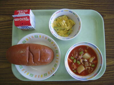 今日の給食献立は、「ポークビーンズ」「かぼちゃサラダ」「黒糖パン」「牛乳」です。