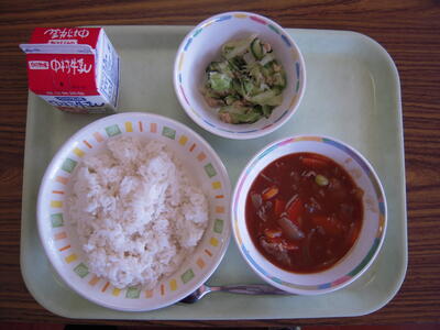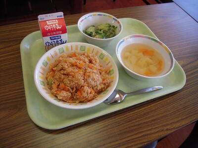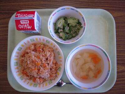 今日の給食献立は、「メキシカンライス」「ポテトスープ」「フレンチサラダ」「牛乳」です。