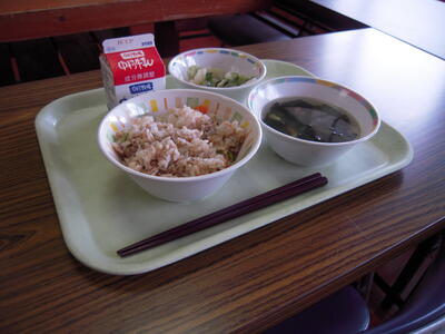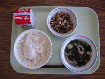今日の給食献立は、「ひじきの炒り煮」「つぼん汁」「ご飯」「牛乳」です。