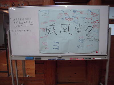 生徒会執行部の皆さんは、体育大会をさらに盛り上げるために書き込み掲示板を準備してくれました。今朝、登校して、掲示板を見つけた生徒の皆さんは、早速、書き込みをしています。