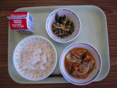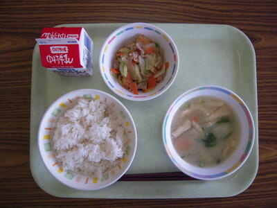 今日の給食献立は、「小松菜の卵とじ」「豚汁」「ご飯」「牛乳」です。