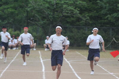 1年生が体力テストをしています。今日は、50M走を測定しています。生徒のみなさんは、一生懸命走っています。