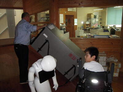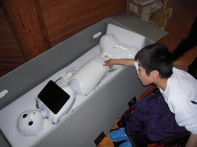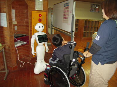 生徒の皆さんがペッパー君の前を通り過ぎると、ペッパー君がダンスを始めました。「一緒に踊ろう!!」とペッパー君が誘うと、生徒の皆さんが足を止めています。