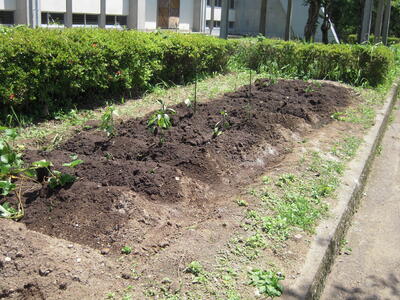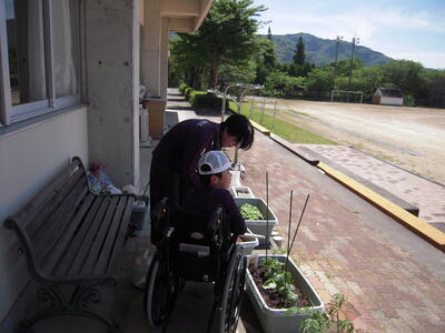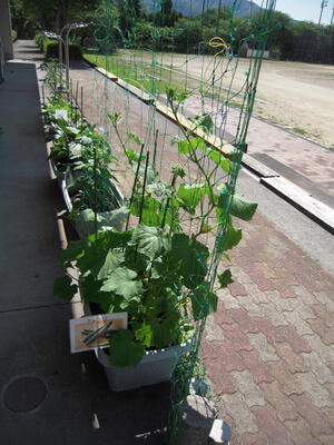 いろいろな野菜をプラター栽培しています。日に日に大きくなっています。もっと、もっと大きくなーれ。そして、たくさん実がなりますように・・・。