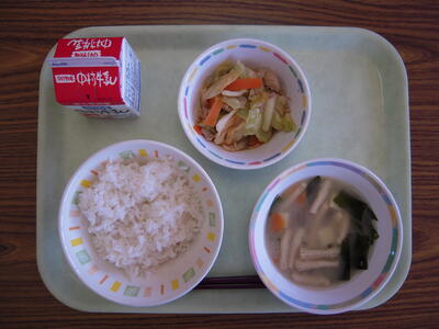 今日の給食献立は、「春キャベツの回鍋肉」「チンゲン菜のスープ」「ご飯」「牛乳」です。
