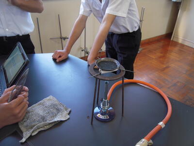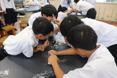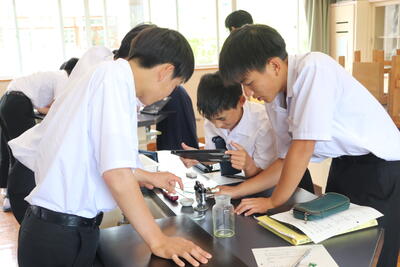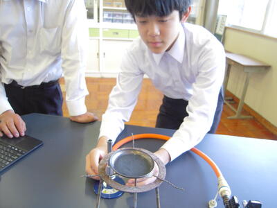 2年生理科の授業の様子です。授業のめあては、「質量保存の法則」を見いだすことです。銅粉を加熱して、酸素と化合(酸化)させる実験を行っています。