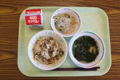 今日の給食献立は、「牛ごぼうごはん」「かみなり汁」「五色あえ」「牛乳」です。
