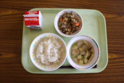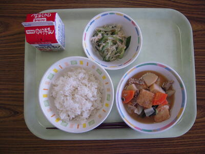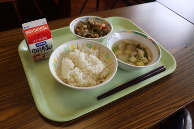 今日の給食献立は、「大和煮」「いものこ汁」「ご飯」「牛乳」です。